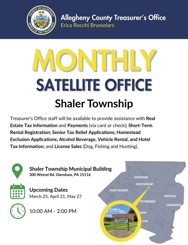The Allegheny County Treasurer's Office will have a satellite office at the Shaler Township Municipal Building during the below days and times.